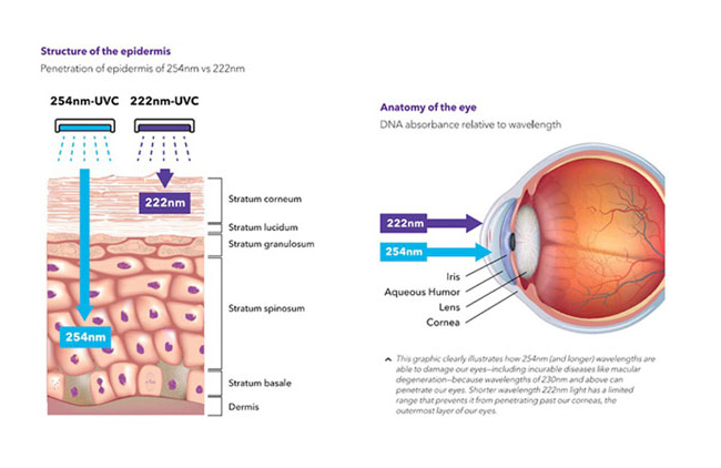 Filtered FAR UVC (222nm) does not penetrate the skin or eyes making it safe to use in occupied spaces.