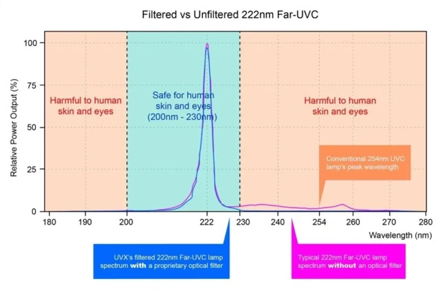 Filtered FAR UVC ensure there is no leakage of dagerous UVC by limiting output to 230nm.